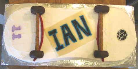 So I finished Ian's cake this morning. Rather than trying to deal with royal icing that would probably just melt into the cake, I used marzipan to make some of the decoration "stickers" on the skateboard. Then I spray painted the numbers on the one end with edible "paint". I'm pleased with how it turned out, considering by the time I was done with icing it last night the smell of the sugar was making me ill. So anyhow, here's a pic of the final cake... not exactly professional quality, but better than I thought it would turn out honestly!